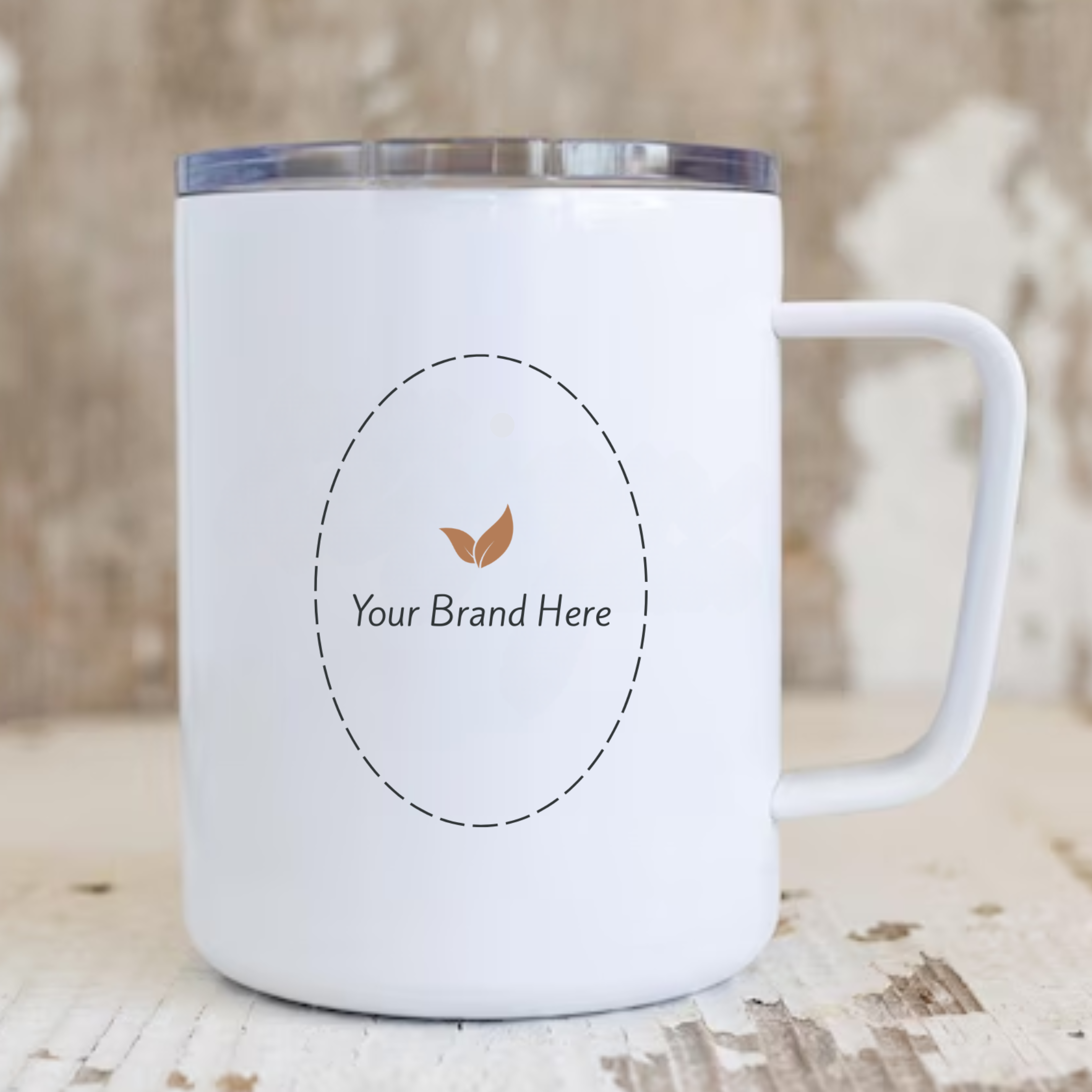 This 12 oz insulated travel mug combines practicality with heartfelt connection. Its clear lid with a secure closure and sturdy handle make it perfect for keeping beverages at the right temperature during busy days. Customize it with your logo to create merchandise that not only promotes your brand but also offers comfort and thoughtfulness to those who use it every day.