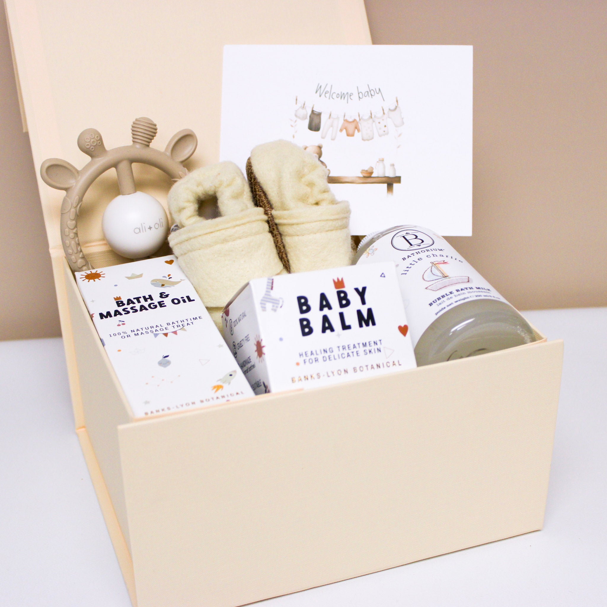 Honor the arrival of a precious baby with our Bundle of Joy Gift Box. A lovingly curated gift box designed to support parents through their most cherished moments. This thoughtful gift combines organic essentials that truly matter: comfortable baby moccasins for growing feet, soothing bubble bath for calming routines, nourishing baby balm for delicate skin protection, and therapeutic massage oil for bonding and relaxation. The adored giraffe teether provides gentle relief during teething while keeping little ones happily engaged. Beautifully presented in our signature cream box, this bundle offers the perfect option for welcoming a new baby. It's a heartfelt gift that says, "We're here to support you with love and care."