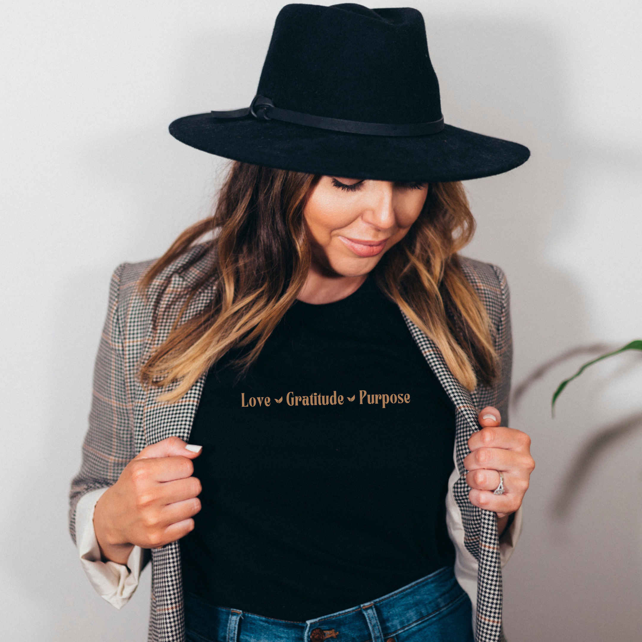 The LOVE, GRATITUDE, PURPOSE Tee is a comfortable, stylish and meaningFull way to express your values and intention. Made with high-quality materials, this tee features minimalistic lettering that showcases your commitment to a MeaningFull Lifestyle. Wear it on its own or layer it under a jacket for a versatile look that will take you from day to night. Whether you're running errands or meeting friends for coffee, this tee is sure to become a great piece in your wardrobe.