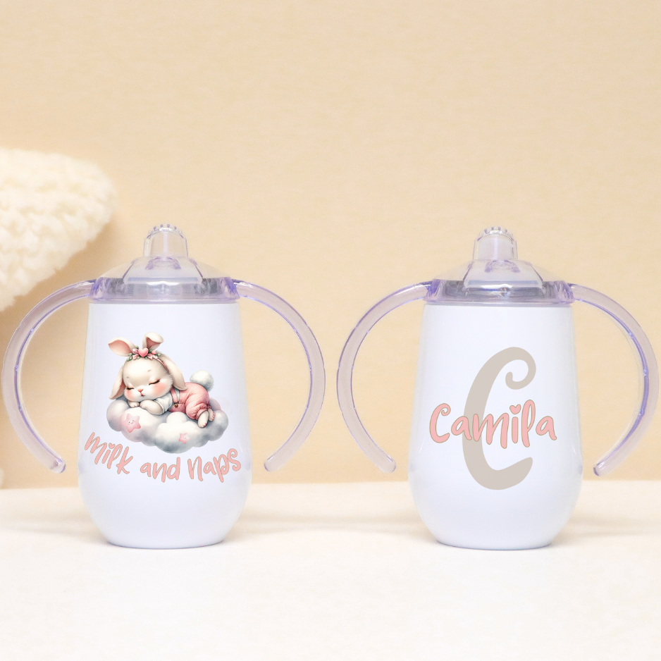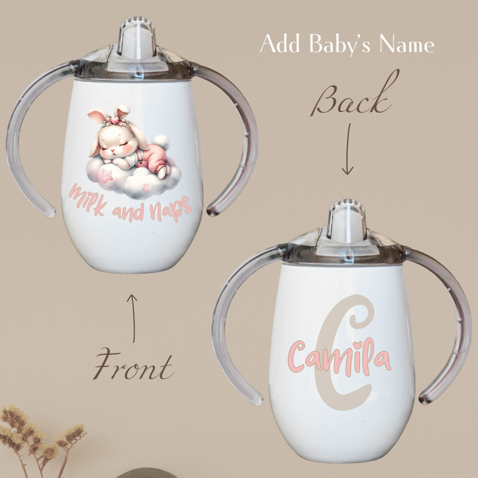 Is there a more adorable sippy cup? Our 'Milk and Naps' sippy cup features a customizable neutral and aesthetic design suitable for any baby girl. Let them sip in style while reminding them how loved they are.